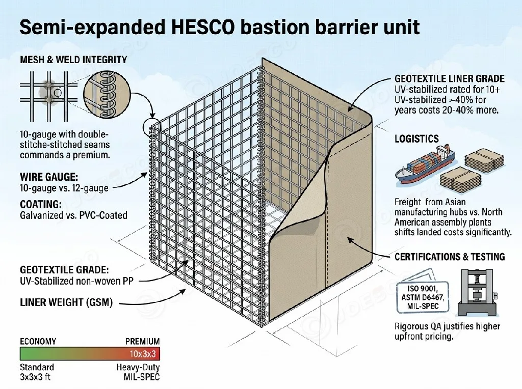 Hesco bastion systems—welded wire mesh units lined with heavy-duty geotextile and filled on-site with soil or sand—have become standard in flood mitigation, temporary military defense, and slope stabilization. Yet, when procurement teams ask, “What is the price of a hesco bag?” the answer is rarely straightforward. Pricing is dynamic, shaped by specification tiers, supply chain variables, and deployment scale.